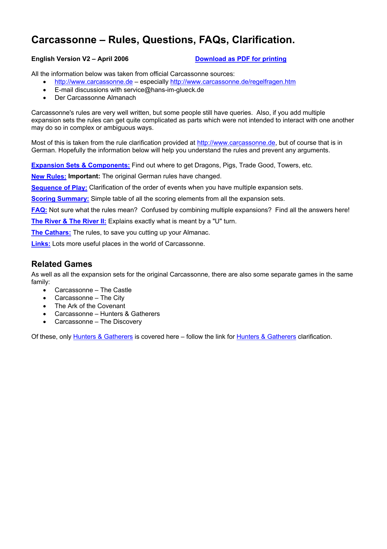 English Version V2 April 2006 Download as PDF for printing All the information below was taken from official Carcassonne sources. The Carcassonne Big Box combines the 2001 Spiel des Jahres winner with eleven of its expansions making it a great starter set for Carcassonne fans and beginners alikeWith it players can experience the games earliest expansions alongside more recent favorites. Any online RGG Big Box Rules complete in pdf or html.